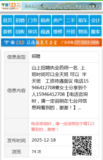 山上招聘执业药师一名 上班时间可以全天班 可以 半天班 工资待遇面议 电话15946412708姜女士分享到个人15946412708 【电话咨询时,请一定说明在七台河信息网看到的,谢谢!】 |