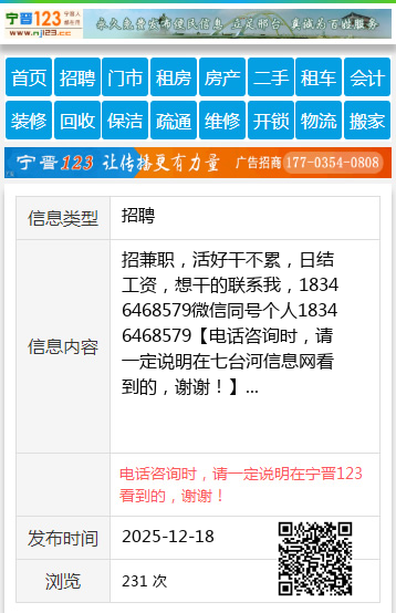 招兼职,活好干不累,日结工资,想干的联系我,18346468579微信同号个人18346468579