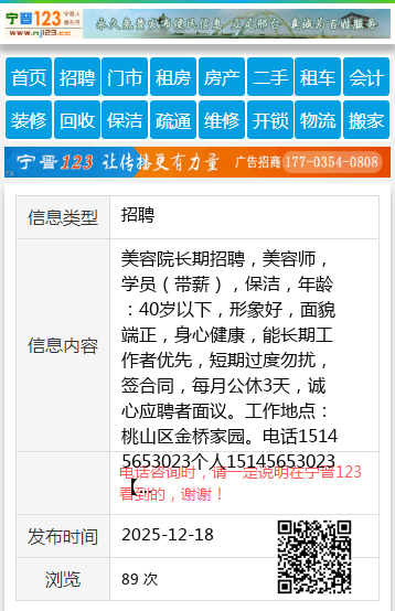 美容院长期招聘,美容师,学员(带薪),保洁,年龄:40岁以下,形象好,面貌端正,身心健康,能长期工作者优先,短期过度勿扰,签合同,每月公休3天,诚心应聘者面议。工作地点:桃山区金桥家园。电话15145653023个人15145653023 【电话咨询时,请一定说明在七台河信息网看到的,谢谢!】 |