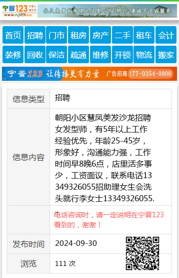 朝阳小区慧凤美发沙龙招聘女发型师,有5年以上工作经验优先,年龄25-45岁,形象好,沟通能力强,工作时间早8晚6点,店里活多事少,工资面议,联系电话13349326055招助理女生会洗头就行李女士13349326055 【电话咨询时,请一定说明在七台河信息网看到的,谢谢!】 |