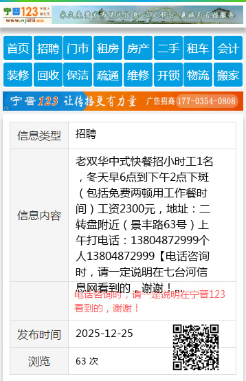 老双华中式快餐招小时工1名,冬天早6点到下午2点下斑(包括免费两顿用工作餐时间)工资2300元,地址:二转盘附近(景丰路63号)上午打电话:13804872999个人13804872999 【电话咨询时,请一定说明在七台河信息网看到的,谢谢!】 |