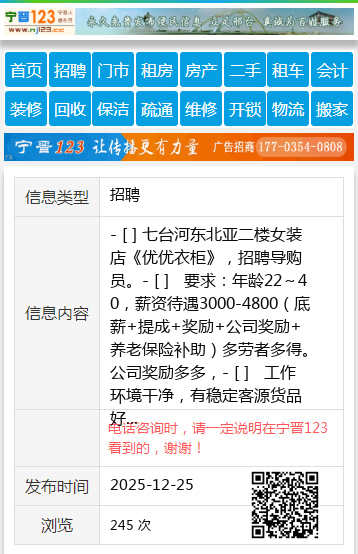 - [ ] 七台河东北亚二楼女装店《优优衣柜》,招聘导购员。- [ ] 要求:年龄22~40,薪资待遇3000-4800(底薪+提成+奖励+公司奖励+养老保险补助)多劳者多得。公司奖励多多,- [ ] 工作环境干净,有稳定客源货品好卖。- [ ] 不会可教。18346495554个人18346495554 【电话咨询时,请一定说明在七台河信息网看到的,谢谢!】 |