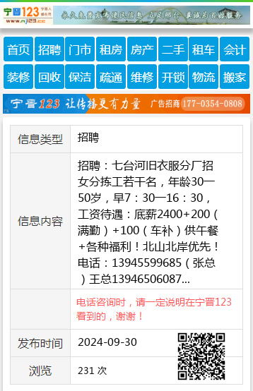 招聘:七台河旧衣服分厂招女分拣工若干名,年龄30一50岁,早7:30一16:30,工资待遇:底薪2400+200(满勤)+100(车补)供午餐+各种福利!北山北岸优先!电话:13945599685(张总)王总13946506087 【电话咨询时,请一定说明在七台河信息网看到的,谢谢!】 |