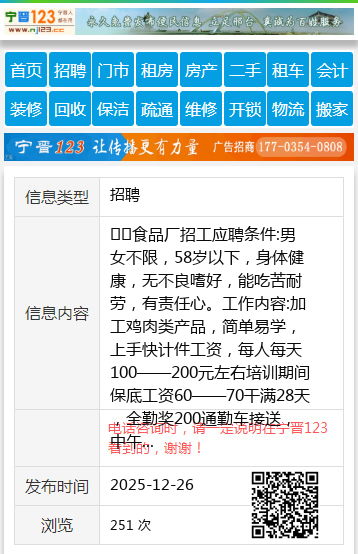 ⚠️食品厂招工应聘条件:男女不限,58岁以下,身体健康,无不良嗜好,能吃苦耐劳,有责任心。工作内容:加工鸡肉类产品,简单易学,上手快计件工资,每人每天100——200元左右培训期间保底工资60——70干满28天,全勤奖200通勤车接送,中午有免费午餐。每月15号发放工资,不拖不欠。工作地点:新兴区,长兴乡☎联系电话13846438433联系人,栗女士个人13846438433 【电话咨询时,请一定说明在七台河信息网看到的,谢谢!】 |