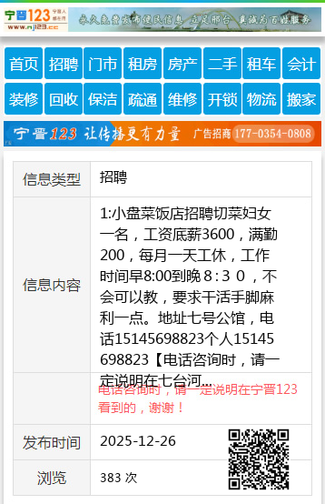 1:小盘菜饭店招聘切菜妇女一名,工资底薪3600,满勤200,每月一天工休,工作时间早8:00到晚8:30,不会可以教,要求干活手脚麻利一点。地址七号公馆,电话15145698823个人15145698823 【电话咨询时,请一定说明在七台河信息网看到的,谢谢!】 |