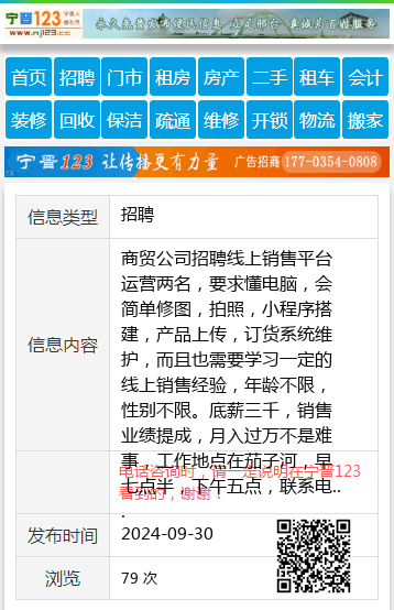 商贸公司招聘线上销售平台运营两名,要求懂电脑,会简单修图,拍照,小程序搭建,产品上传,订货系统维护,而且也需要学习一定的线上销售经验,年龄不限,性别不限。底薪三千,销售业绩提成,月入过万不是难事,工作地点在茄子河,早七点半,下午五点,联系电话,微信15046406678.张经理15046406678