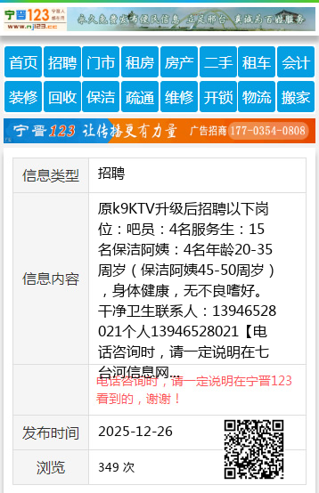 原k9KTV升级后招聘以下岗位:吧员:4名服务生:15名保洁阿姨:4名年龄20-35周岁(保洁阿姨45-50周岁),身体健康,无不良嗜好。干净卫生联系人:13946528021个人13946528021 【电话咨询时,请一定说明在七台河信息网看到的,谢谢!】 |