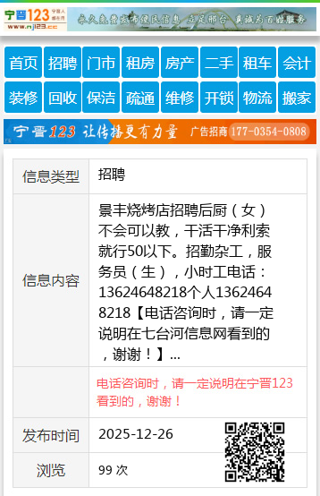 景丰烧烤店招聘后厨(女)不会可以教,干活干净利索就行50以下。招勤杂工,服务员(生),小时工电话:13624648218个人13624648218 【电话咨询时,请一定说明在七台河信息网看到的,谢谢!】 |