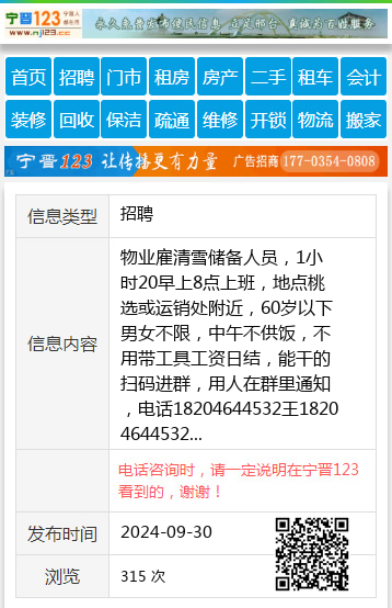 物业雇清雪储备人员,1小时20早上8点上班,地点桃选或运销处附近,60岁以下男女不限,中午不供饭,不用带工具工资日结,能干的扫码进群,用人在群里通知,电话18204644532王18204644532 【电话咨询时,请一定说明在七台河信息网看到的,谢谢!】 |
