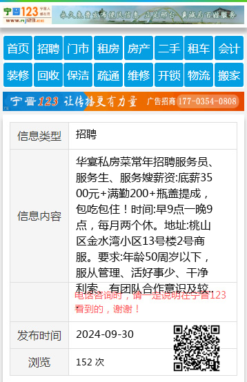 华宴私房菜常年招聘服务员、服务生、服务嫂薪资:底薪3500元+满勤200+瓶盖提成,包吃包住!时间:早9点一晚9点,每月两个休。地址:桃山区金水湾小区13号楼2号商服。要求:年龄50周岁以下,服从管理、活好事少、干净利索、有团队合作意识及较强语言沟通能力。杨经理16534641999 【电话咨询时,请一定说明在七台河信息网看到的,谢谢!】 |
