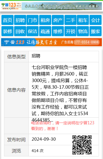 七台河职业学院负一楼招聘销售精英,月薪2600,转正3000元,提成另算,公休4-5天,早8.30-17.00节假日正常放假,工作内容招商项目做前期项目介绍,不管你有没有工作经验,都可以来试试,期待你的加入女士15344644385 【电话咨询时,请一定说明在七台河信息网看到的,谢谢!】 |