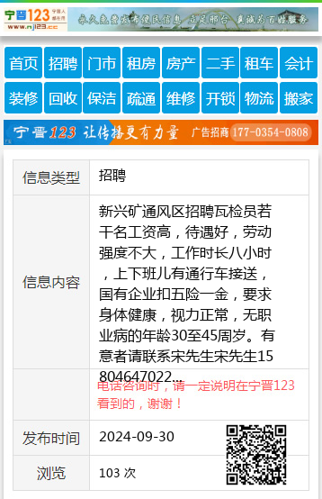 新兴矿通风区招聘瓦检员若干名工资高,待遇好,劳动强度不大,工作时长八小时,上下班儿有通行车接送,国有企业扣五险一金,要求身体健康,视力正常,无职业病的年龄30至45周岁。有意者请联系宋先生宋先生15804647022 【电话咨询时,请一定说明在七台河信息网看到的,谢谢!】 |