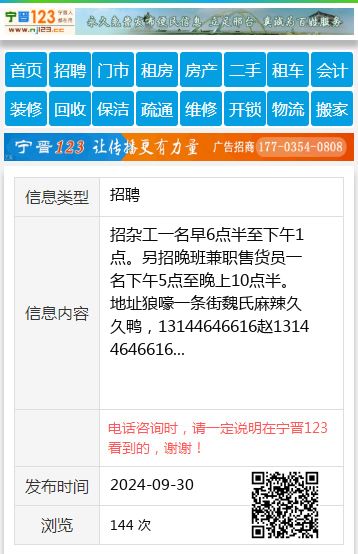 招杂工一名早6点半至下午1点。另招晚班兼职售货员一名下午5点至晚上10点半。地址狼嚎一条街魏氏麻辣久久鸭,13144646616赵13144646616 【电话咨询时,请一定说明在七台河信息网看到的,谢谢!】 |