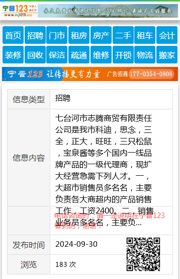 七台河市志腾商贸有限责任公司是我市科迪,思念,三全,正大,旺旺,三只松鼠,宝泉酱等多个国内一线品牌产品的一级代理商,现扩大经营急需下列人才。一,大超市销售员多名名,主要负责各大商超内的产品销售工作,工资2400。二,销售业务员多名名,主要负责本市内大小超市的产品推广工作,销售业绩提成,工资5000+。三,库管一名,管理库房,工资面议。四,内勤一名,要求会简单的电脑及办公软件操作。五,送货司机多名,往超市饭送货,一人一台车,C1证即可,早六点上班,下午四五点就下班了,一天一趟货,不忙的时候就是大半天活。以上工作有意者请拨打张经理电话15046406678张经理15046406678 【电话咨询时,请一定说明在七台河信息网看到的,谢谢!】 |