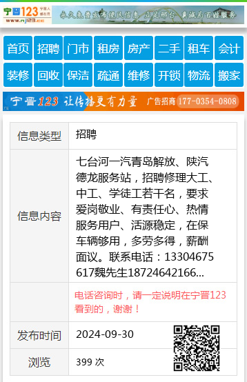 七台河一汽青岛解放、陕汽德龙服务站,招聘修理大工、中工、学徒工若干名,要求爱岗敬业、有责任心、热情服务用户、活源稳定,在保车辆够用,多劳多得,薪酬面议。联系电话:13304675617魏先生18724642166 【电话咨询时,请一定说明在七台河信息网看到的,谢谢!】 |