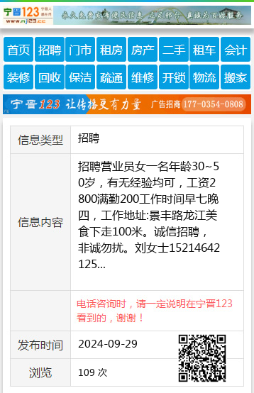 招聘营业员女一名年龄30~50岁,有无经验均可,工资2800满勤200工作时间早七晚四,工作地址:景丰路龙江美食下走100米。诚信招聘,非诚勿扰。刘女士15214642125 【电话咨询时,请一定说明在七台河信息网看到的,谢谢!】 |