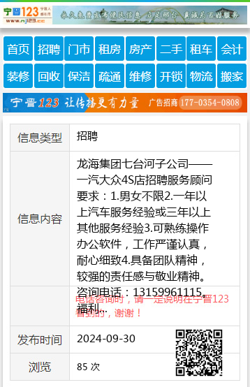 龙海集团七台河子公司——一汽大众4S店招聘服务顾问要求:1.男女不限2.一年以上汽车服务经验或三年以上其他服务经验3.可熟练操作办公软件,工作严谨认真,耐心细致4.具备团队精神,较强的责任感与敬业精神。咨询电话:13159961115。福利待遇:工作时间8:20-16:50,每周单休!午餐有食堂!缴纳五险!不压工资!李女士13946581451 【电话咨询时,请一定说明在七台河信息网看到的,谢谢!】 |
