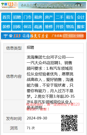 龙海集团七台河子公司——一汽大众4S店招聘1、销售顾问要求:1.有汽车领域岗位从业经验者优先,愿意挑战高收入,爱好销售,沟通能力强,不安于现状者,只要你有能力,月入过万不是梦。2.男女不限3.年龄20-35岁4.非汽车领域岗位从业人员无须担心,公司有专人培训。咨询电话:181046466642、服务顾问要求:1.男女不限2.一年以上汽车服务经验或三年以上其他服务经验3.可熟练操作办公软件,工作严谨认真,耐心细致4.具备团队精神,较强的责任感与敬业精神。咨询电话:13159961115。3、钣金师傅要求:有三年及以上的工作经验,有焊工证。2、工作责任心强,主动积极,能吃苦耐劳,尊重领导,服从管理。3、认真负责,良好的职业道德。咨询电话:13159961115。福利待遇:工作时间8:20-16:50,每周单休!午餐有食堂!缴纳五险!不压工资!李女士13946581451 【电话咨询时,请一定说明在七台河信息网看到的,谢谢!】 |