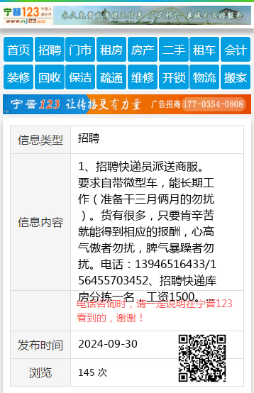 1、招聘快递员派送商服。要求自带微型车,能长期工作(准备干三月俩月的勿扰)。货有很多,只要肯辛苦就能得到相应的报酬,心高气傲者勿扰,脾气暴躁者勿扰。电话:13946516433/156455703452、招聘快递库房分拣一名,工资1500。每天负责挑件,早五点-9/10点左右,一般4小时左右就下班了。电话15645570345刘经理15645570345 【电话咨询时,请一定说明在七台河信息网看到的,谢谢!】 |
