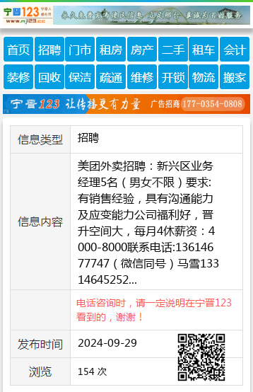 美团外卖招聘:新兴区业务经理5名(男女不限)要求:有销售经验,具有沟通能力及应变能力公司福利好,晋升空间大,每月4休薪资:4000-8000联系电话:13614677747(微信同号)马雪13314645252