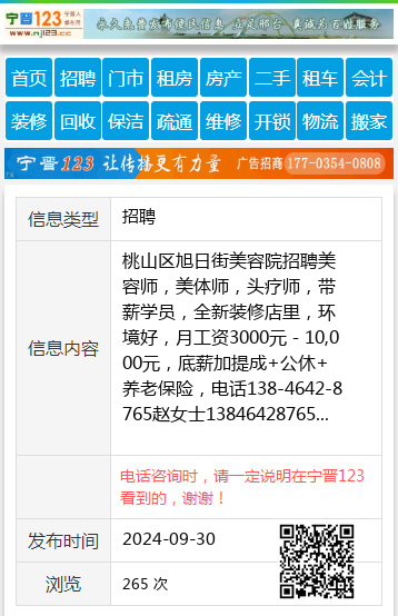 桃山区旭日街美容院招聘美容师,美体师,头疗师,带薪学员,全新装修店里,环境好,月工资3000元-10,000元,底薪加提成+公休+养老保险,电话138-4642-8765赵女士13846428765 【电话咨询时,请一定说明在七台河信息网看到的,谢谢!】 |