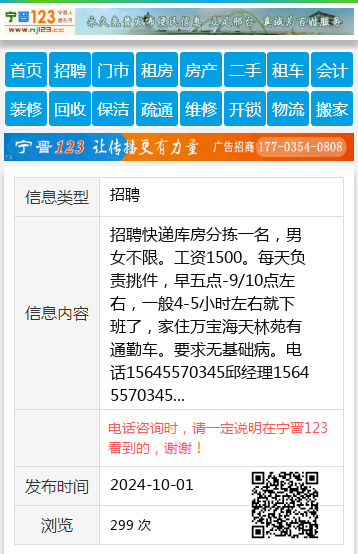 招聘快递库房分拣一名,男女不限。工资1500。每天负责挑件,早五点-9/10点左右,一般4-5小时左右就下班了,家住万宝海天林苑有通勤车。要求无基础病。电话15645570345邱经理15645570345