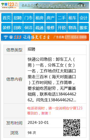 快递公司急招:卸车工人(男)一名,分拣工女(女)一名,工作地点红太阳道口里走三百米(海天对面道口)工作时间短,工作简单,要求能吃苦耐劳,无严重基础病,联系电话13846446262。闫先生13846446262 【电话咨询时,请一定说明在七台河信息网看到的,谢谢!】 |