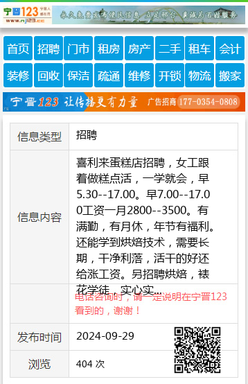 喜利来蛋糕店招聘,女工跟着做糕点活,一学就会,早5.30--17.00。早7.00--17.00工资一月2800--3500。有满勤,有月休,年节有福利。还能学到烘焙技术,需要长期,干净利落,活干的好还给涨工资。另招聘烘焙,裱花学徒,实心实意的交技术,想学的来吧15045252566马女士13946587684 【电话咨询时,请一定说明在七台河信息网看到的,谢谢!】 |