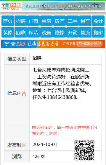 七台河德啤烤肉招聘洗碗工,工资高待遇好,在欧洲新城附近住有工作经验者优先。地址:七台河市欧洲新城。任先生13846438868 【电话咨询时,请一定说明在七台河信息网看到的,谢谢!】 |