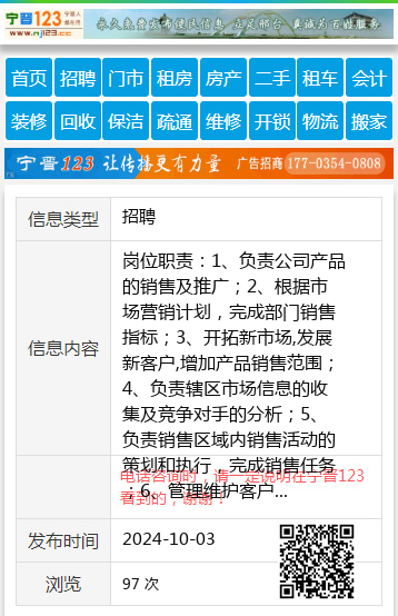 岗位职责:1、负责公司产品的销售及推广;2、根据市场营销计划,完成部门销售指标;3、开拓新市场,发展新客户,增加产品销售范围;4、负责辖区市场信息的收集及竞争对手的分析;5、负责销售区域内销售活动的策划和执行,完成销售任务;6、管理维护客户关系以及客户间的长期战略合作计划。任职资格:1、市场营销等相关专业;2、1-2年以上销售行业工作经验,业绩突出者优先;3、反应敏捷、表达能力强,具有较强的沟通能力及交际技巧,具有亲和力;4、具备一定的市场分析及判断能力,良好的客户服务意识;5、有责任心,能承受较大的工作压力;6、有团队协作精神,善于挑战。工作时间:早7:30晚6曹经理15804640833 【电话咨询时,请一定说明在七台河信息网看到的,谢谢!】 |