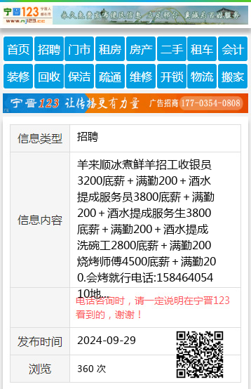 羊来顺冰煮鲜羊招工收银员3200底薪+满勤200+酒水提成服务员3800底薪+满勤200+酒水提成服务生3800底薪+满勤200+酒水提成洗碗工2800底薪+满勤200烧烤师傅4500底薪+满勤200.会烤就行电话:15846405410地址:狼嚎中段陈女士15846405410 【电话咨询时,请一定说明在七台河信息网看到的,谢谢!】 |