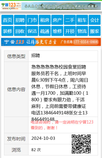 急急急急急急校园食堂招聘服务员若干名,上班时间早晨6:30到下午4点,周六周日休息,节假日休息,工资待遇一月1700,加满勤100(1800)要求有眼力劲,干活麻利,上岗前需要带健康证电话13846449148张女士13846449148 【电话咨询时,请一定说明在七台河信息网看到的,谢谢!】 |