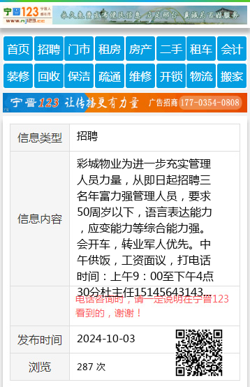 彩城物业为进一步充实管理人员力量,从即日起招聘三名年富力强管理人员,要求50周岁以下,语言表达能力,应变能力等综合能力强。会开车,转业军人优先。中午供饭,工资面议,打电话时间:上午9:00至下午4点30分杜主任15145643143 【电话咨询时,请一定说明在七台河信息网看到的,谢谢!】 |