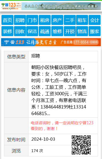 朝阳小区快餐店招聘吧员,要求:女,50岁以下,工作时间:早七点—晚六点,有公休,工龄工资,工作简单轻松,工资3000元,干满三个月涨工资,有意者电话联系!13846448199杜13314646815 【电话咨询时,请一定说明在七台河信息网看到的,谢谢!】 |
