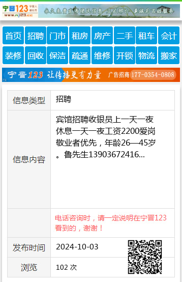 宾馆招聘收银员上一天一夜休息一天一夜工资2200爱岗敬业者优先,年龄26—45岁。鲁先生13903672416