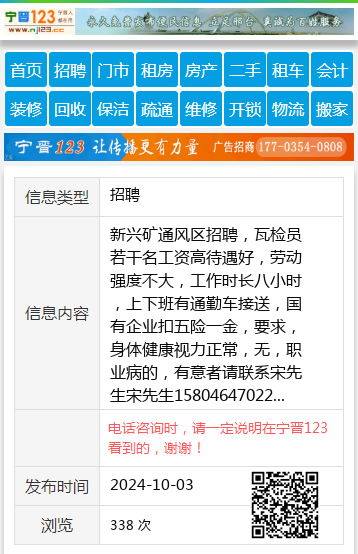 新兴矿通风区招聘,瓦检员若干名工资高待遇好,劳动强度不大,工作时长八小时,上下班有通勤车接送,国有企业扣五险一金,要求,身体健康视力正常,无,职业病的,有意者请联系宋先生宋先生15804647022 【电话咨询时,请一定说明在七台河信息网看到的,谢谢!】 |