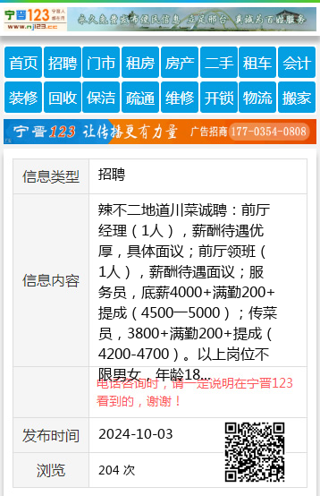 辣不二地道川菜诚聘:前厅经理(1人),薪酬待遇优厚,具体面议;前厅领班(1人),薪酬待遇面议;服务员,底薪4000+满勤200+提成(4500一5000);传菜员,3800+满勤200+提成(4200-4700)。以上岗位不限男女,年龄18-50岁。员工待遇,供吃供住,每月带薪休息2天,工龄每6个月涨50元,合理晋升机制。地址:七台河市文华路92号(七号公馆一期)电话:15846195888祝15846195888 |