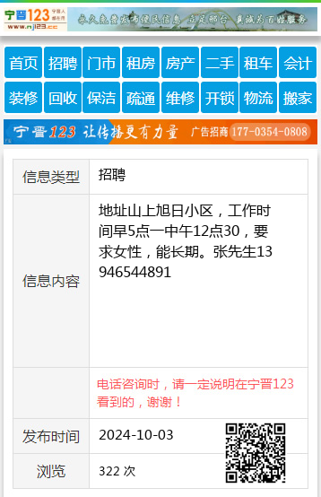 地址山上旭日小区,工作时间早5点一中午12点30,要求女性,能长期。张先生13946544891