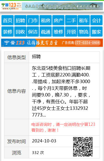东北亚5楼美食档口招聘长期工,工资底薪2200.满勤400..带提成,加起来差不多3000.,每个月1天带薪休息,时间要9.00,晚7.30,,要求,干净,有责任心。年龄不超过45岁女士王女士13329327773 【电话咨询时,请一定说明在七台河信息网看到的,谢谢!】 |