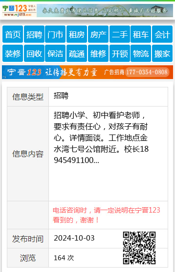 招聘小学、初中看护老师,要求有责任心,对孩子有耐心。详情面谈。工作地点金水湾七号公馆附近。校长18945491100