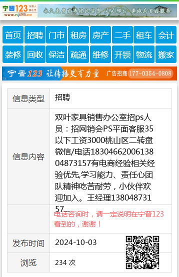 双叶家具销售办公室招ps人员:招网销会PS平面客服35以下工资3000桃山区二转盘微信/电话1830466200613804873157有电商经验相关经验优先,学习能力、责任心团队精神吃苦耐劳,小伙伴欢迎加入。王经理13804873157 【电话咨询时,请一定说明在七台河信息网看到的,谢谢!】 |