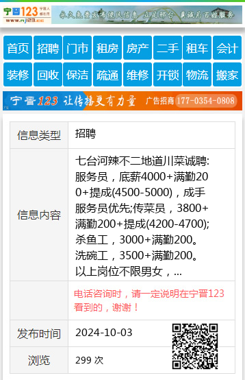 七台河辣不二地道川菜诚聘:服务员,底薪4000+满勤200+提成(4500-5000),成手服务员优先;传菜员,3800+满勤200+提成(4200-4700);杀鱼工,3000+满勤200。洗碗工,3500+满勤200。以上岗位不限男女,年龄23-55岁。员工待遇,供吃供住,每月带薪休息2天,工龄每6个月涨50元,合理晋升机制。地址:七台河市文华路92号(七号公馆一期)电话:15846195888电话:15846195888祝13904670003 【电话咨询时,请一定说明在七台河信息网看到的,谢谢!】 |
