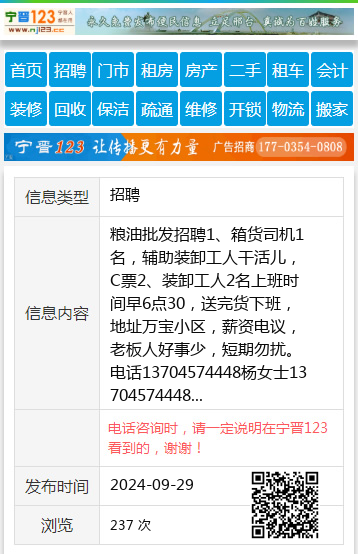粮油批发招聘1、箱货司机1名,辅助装卸工人干活儿,C票2、装卸工人2名上班时间早6点30,送完货下班,地址万宝小区,薪资电议,老板人好事少,短期勿扰。电话13704574448杨女士13704574448 【电话咨询时,请一定说明在七台河信息网看到的,谢谢!】 |