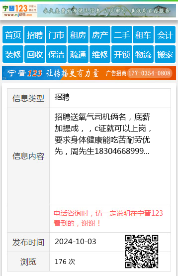 招聘送氧气司机俩名,底薪加提成,,c证就可以上岗,要求身体健康能吃苦耐劳优先,周先生18304668999