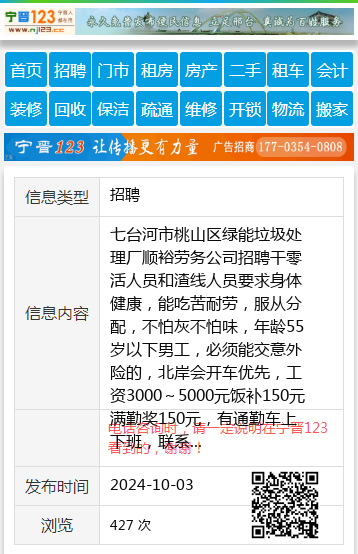 七台河市桃山区绿能垃圾处理厂顺裕劳务公司招聘干零活人员和渣线人员要求身体健康,能吃苦耐劳,服从分配,不怕灰不怕味,年龄55岁以下男工,必须能交意外险的,北岸会开车优先,工资3000~5000元饭补150元满勤奖150元,有通勤车上下班,联系电话18724646568(蔡队)蔡军武18724646568 【电话咨询时,请一定说明在七台河信息网看到的,谢谢!】 |