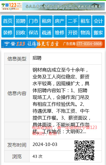 钢材商店成立至今十余年,业务及工人岗位稳定、薪资水平较高,因规模扩大,具体招聘内容如下:1、招聘现场工人,会操作龙门吊及有相应工作经验优先。2、待遇优厚、不拖工资、中午提供工作餐。3、薪资面议,具体面谈,不能长期工作勿扰。工作地点:大明街218号聚兴钢材(大明街与冠军路十字路口东南)。联系人:高师傅联系电话:13945589367高师傅13945589367 【电话咨询时,请一定说明在七台河信息网看到的,谢谢!】 |