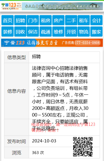 法律咨询中心招聘法律销售顾问,属于电话销售,无需跟客户见面,有话术有资料,公司负责培训,有组长带,工作时间9~5点,午休一小时,周日休息,无责底薪2000+高额返点,月收入3000~5500左右,正规公司,手续齐全,只要能适应,属于长远稳定的工作,男女不限,宝妈工作时间上找我单聊,咱们有宝妈岗,工作地址在山上衣世界对面电商园一楼,楼下就是公交站点,其他具体电话或微信详谈,沟通能力强,会谈单,懂销售优先姜女士18346496555 【电话咨询时,请一定说明在七台河信息网看到的,谢谢!】 |
