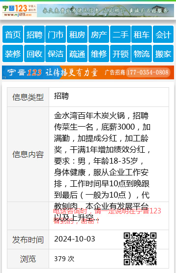 金水湾百年木炭火锅,招聘传菜生一名,底薪3000,加满勤,加提成分红,加工龄奖,干满1年增加绩效分红,要求:男,年龄18-35岁,身体健康,服从企业工作安排,工作时间早10点到晚跟到最后(一般为10点),代教刨肉,本企业有发展平台以及上升空间,有意者电话:0464-8139999,到店面试周经理13624648384 【电话咨询时,请一定说明在七台河信息网看到的,谢谢!】 |