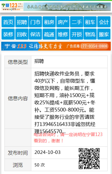 招聘快递收件业务员,要求40岁以下,自带微型车,懂微信及网购,能长期工作,短期不用,油补1500元+揽收25%提成+底薪500元+冬补。工资5500-8000元。能接受了服务行业的辛苦请拨打13946516433非诚勿扰经理15645570345 【电话咨询时,请一定说明在七台河信息网看到的,谢谢!】 |