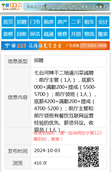 七台河辣不二地道川菜诚聘:前厅主管(1人),底薪5000+满勤200+提成(5500-5700);前厅领班(1人),底薪4200+满勤200+提成(4700-5200);前厅主管和前厅领班有餐饮互联网运营经验的优先、薪资另议。收银员(1人),底薪3800+满勤200+提成(4300-4700);以上岗位成手优先、不限男女,年龄23-35岁。员工待遇,供吃供住,每月满勤带薪休假2天,生日和节日福利,工龄6个月涨50元,季度和年度经营业绩奖金,合理晋升机制。联系人:杜先生联系电话:19845570003、15846195888工作地址:七台河市桃山区文华路92号杜先生19845570003 【电话咨询时,请一定说明在七台河信息网看到的,谢谢!】 |